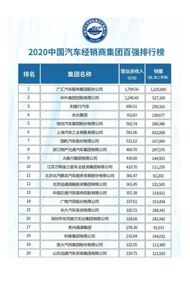 2020中国汽车经销商集团百强排行榜发布,中升集团位列第二